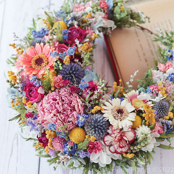 オーダーを受けてお作りする三日月リースです 色・サイズをご指定いただけます こちらのページからのご注文の場合は下記の仕様でおつくりします サイズ : 直径約18〜20cm カラー : 1枚目の写真(ピンク)のイメージ (その他の写真のイメージをご希望の場合はお問い合わせフォームからご相談ください。追ってお見積り金額をお伝えいたします) 納期 : 約2週間 直径25cmの場合はプラス3300円、直径30cmの場合はプラス5500円となります。 その他、使用花材に指定がある場合やお急ぎの場合はプラス料金となることがあります。 詳細なご希望がある場合は、サイズ・カラー・ご用途・お届け希望時期などを事前にお問い合わせフォームからお送りください。 専用ページをお作りしてご対応申し上げます。
